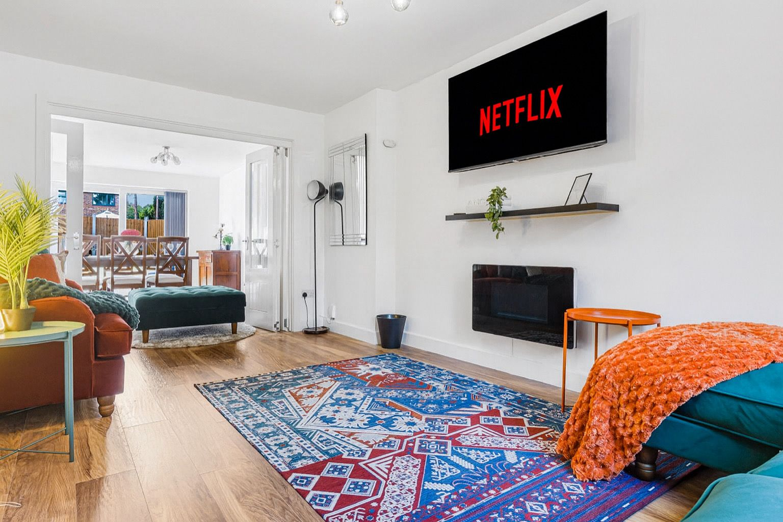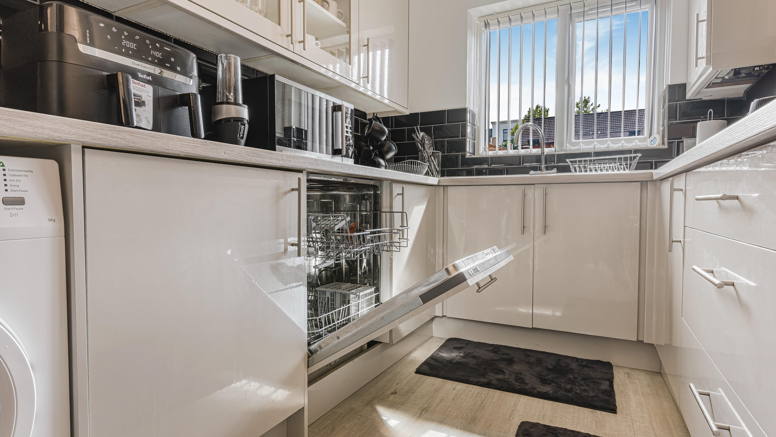 Inside, you’ll find four separate bedrooms, each thoughtfully furnished for comfort and privacy, complete with Smart TVs so everyone can relax in their own space. The fully fitted kitchen is equipped with everything you need to prepare meals during your stay, and the dining area provides a welcoming spot to enjoy them together.